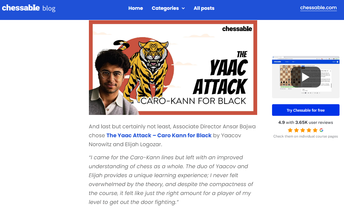 Check it out! IM Yaacov's Caro-Kann course is selected by Chessable's Associate Director, Ansar Bajwa, as his top pick for 2024!