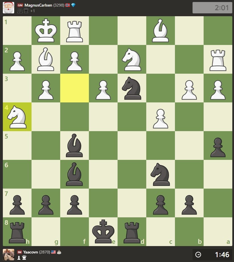 That's right. Magnus is confronted once again with the force of Dacha! There's a lot to learn from this one. Imagine you're playing as black. Magnus just moved. What's your move? Check to see if it matches IM Yaacov's.